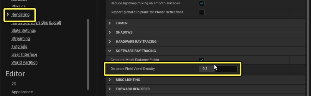 하드웨어 레이 트레이싱을 사용할 때 이 CVar를 0으로 시작하면 DistanceField가 로드되지 않는다.