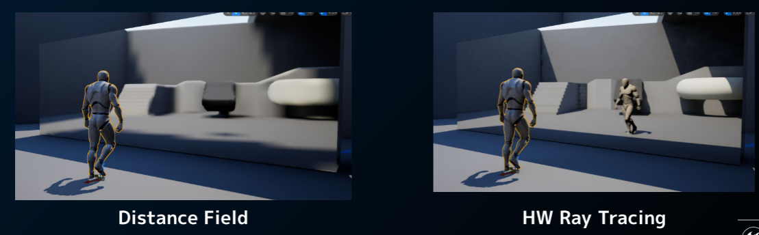 Distance Field는 어디까지나 오브젝트의 간이 표현이며, 실제의 폴리곤 메쉬 정도의 정확성을 가지지 않는다. 거울과 같은 선명한 반영은 Distance Field에서는 실현할 수 없다.