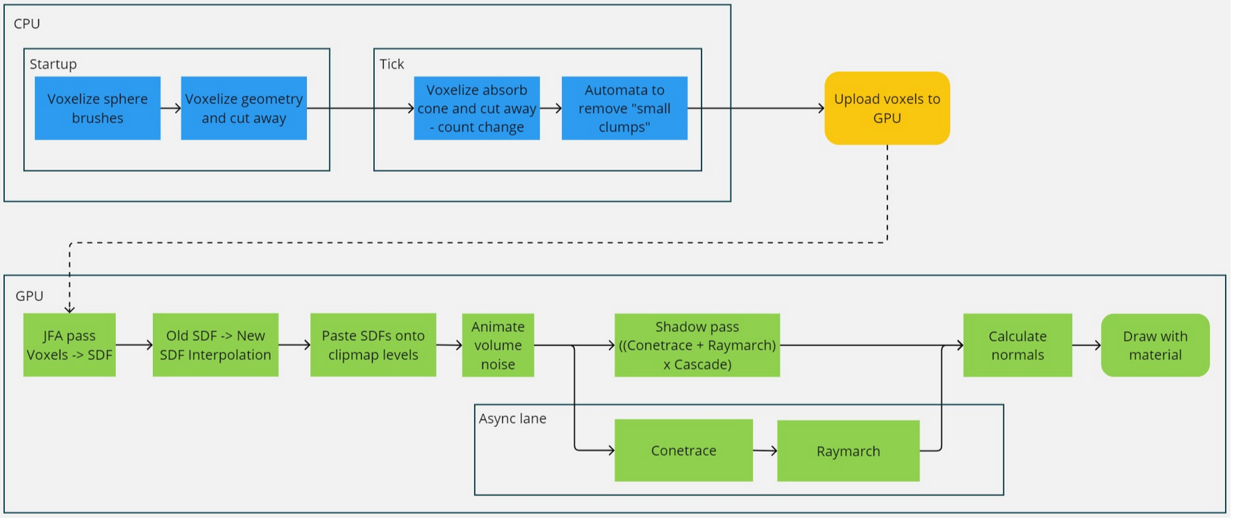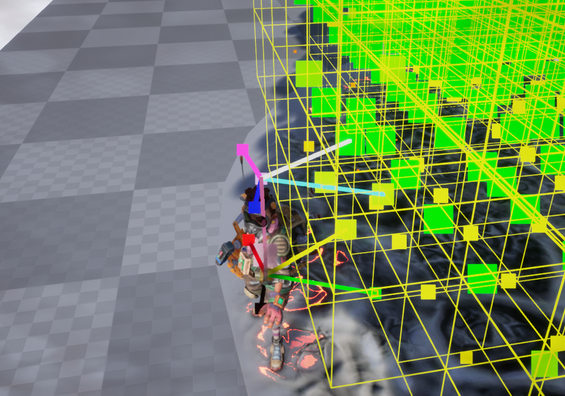 CPU 측에서 우리는 구형 액터를 게임 플레이 중에 추적할 수 있는 복셀 볼륨으로 처리합니다. 또한 플레이어가 상호 작용하는 대상이기도 합니다. 우리가 최종적으로 렌더링하는 것보다 훨씬 거칠지만 해상도는 이 게임에서 사용하는 종류의 상호 작용과 충돌 감지에 충분합니다.