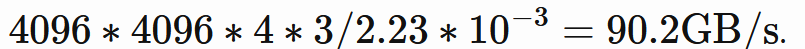4096x4096 행렬 곱셈으로 다시 돌아가면 기본적으로 2 * 4096 * 4096 * 4096 연산을 수행해야 합니다. 61 TFLops 구현을 사용하면 작업을 수행하는 데 약 2.23ms가 걸리고 이 속도를 유지하는 데 필요한 대역폭은 다음과 같습니다.