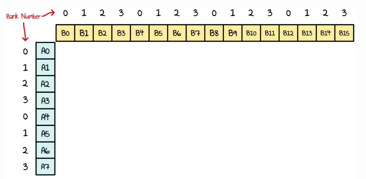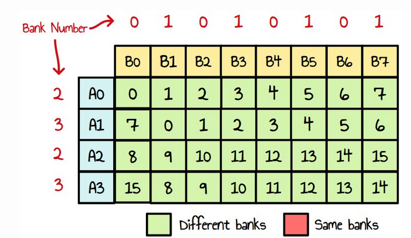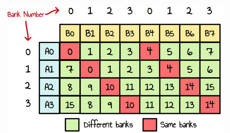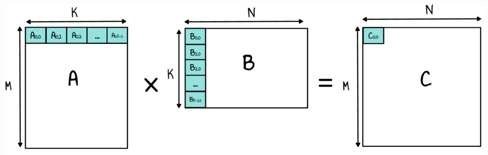 우리의 단순한 커널의 주요 문제는 내부 루프가 글로벌 메모리에 직접 액세스한다는 것입니다. 글로벌 메모리에서 데이터를 가져오는 데는 일반적으로 수백 사이클 정도의 대기 시간이 걸리기 때문에 비효율적입니다. 각 메모리 읽기는 최소한의 계산(곱셈 한 번과 덧셈 한 번만)이 이어지기 때문에 GPU는 많은 수의 동시 스레드가 있어도 이 대기 시간을 숨기는 데 어려움을 겪습니다. 게다가 이 알고리즘은 여러 스레드에서 글로벌 메모리에서 동일한 행과 열을 반복적으로 읽어 중복 메모리 액세스가 발생하고 성능 병목 현상이 더욱 심화됩니다.