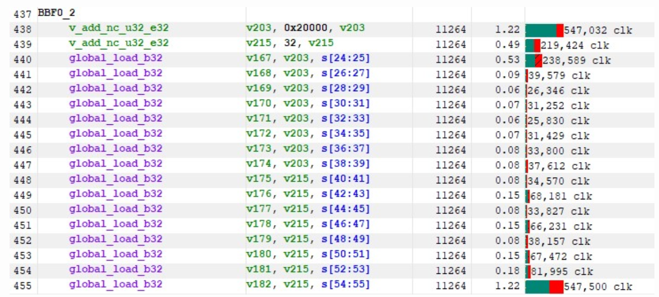 글로벌 메모리 대기에 대한 누적 대기 시간은 1,200만 클럭 사이클을 초과하는데, 이는 내부 루프의 LDS 로드 대기 시간보다 4배 더 큽니다.