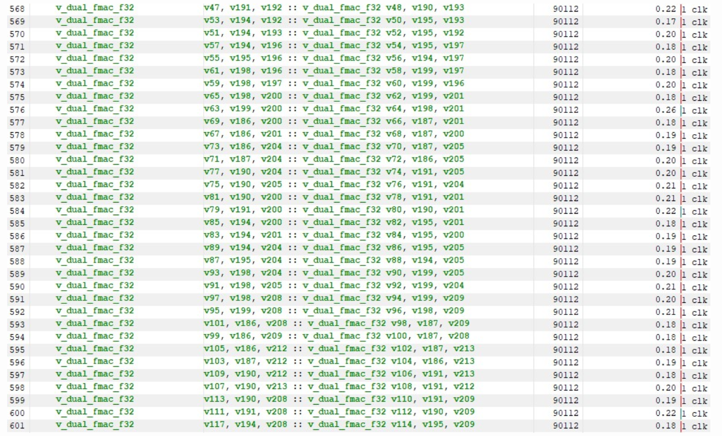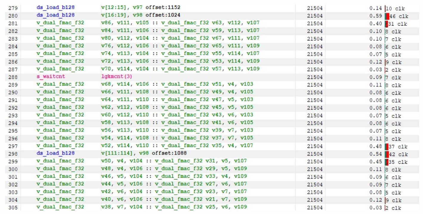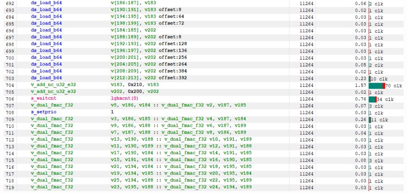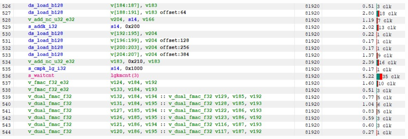 이 ISA를 살펴보면, 우리의 내부 루프는 v_dual_fmac 명령어로만 구성되어 있으며, 각각은 1주기 지연 시간을 갖습니다. 아름답네요!