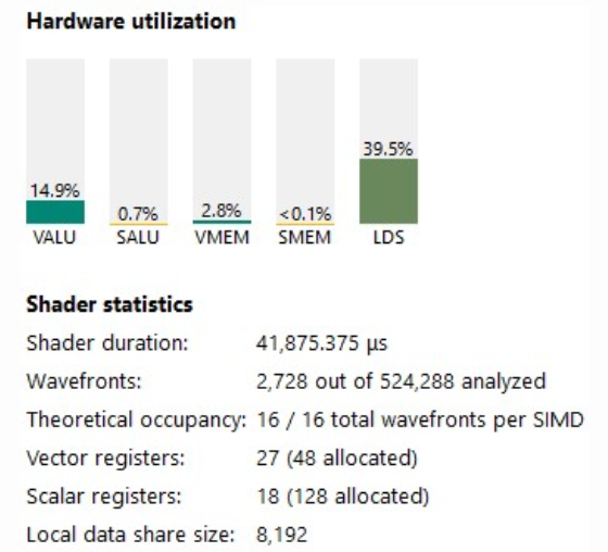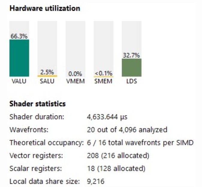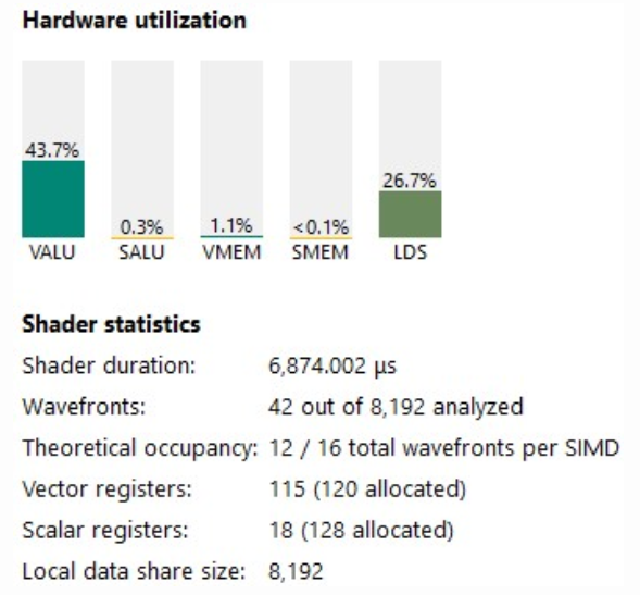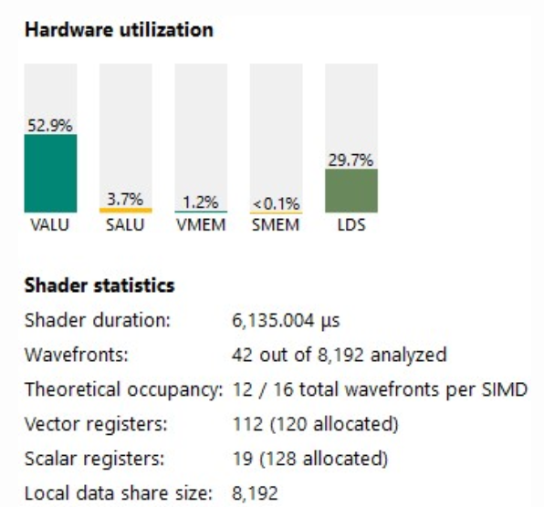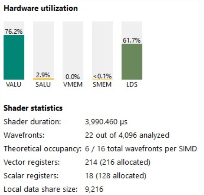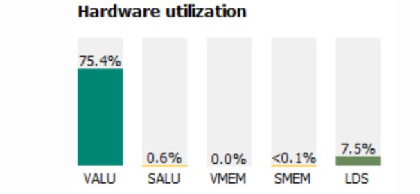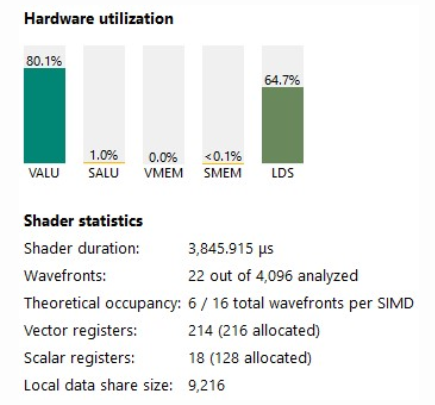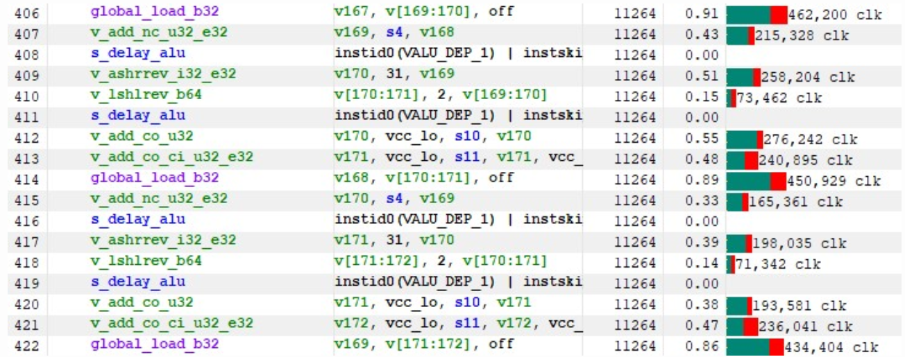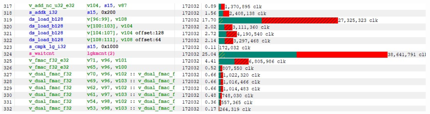이를 고려하면 이 커널의 VALU7 활용도는 매우 인상적이며 거의 100%입니다. 그러나 이러한 이중 이슈 명령을 제대로 활용할 수 없다는 것은 정말 놀랍습니다. 나중에 설명하겠습니다.