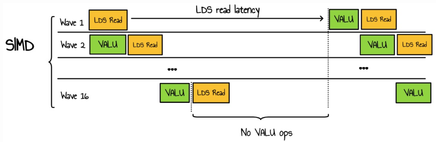 여기서 우리는 병렬로 많은 웨이브를 시작하는 고점유 커널을 가지고 있으며, 모두 LDS에 대한 액세스를 위해 경쟁합니다. VALU 연산에 걸리는 시간이 LDS 대기 시간보다 짧기 때문에 추가 스레드가 있어도 대기 시간을 숨길 수 없습니다. 이는 대기 시간으로 인해 LDS 대역폭 혼잡과 리소스 낭비를 초래합니다.