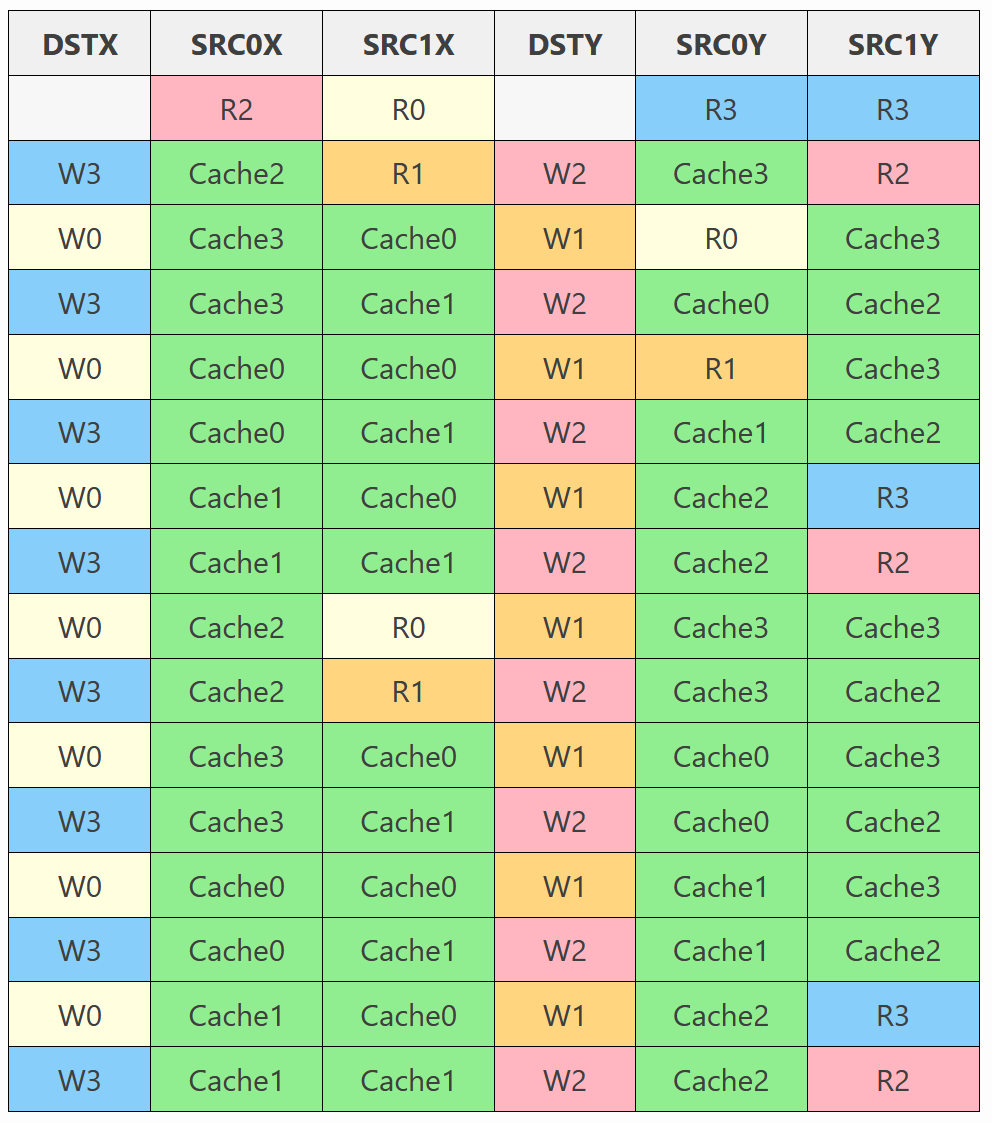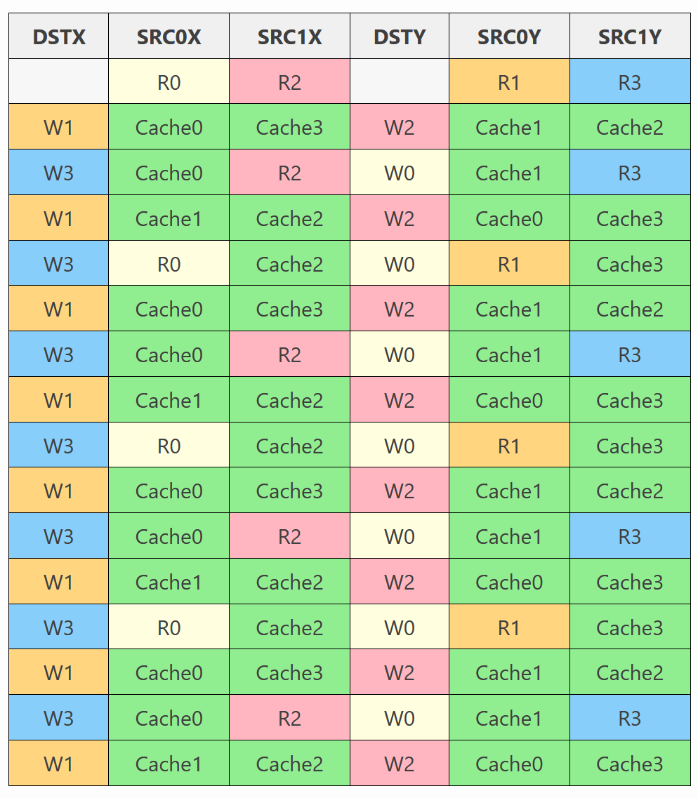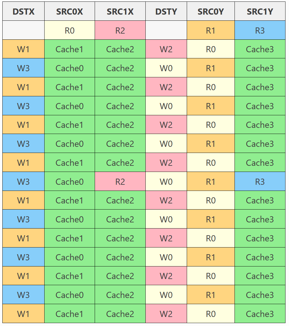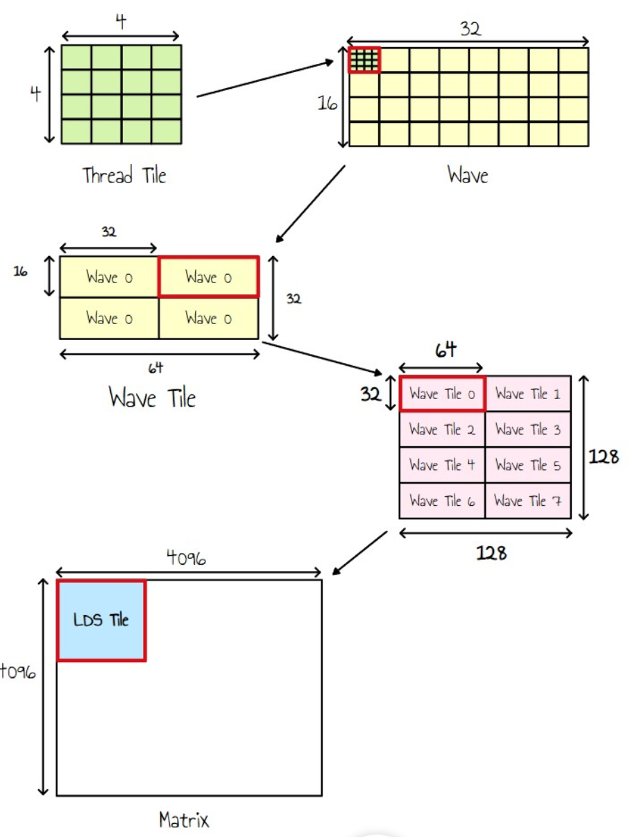 - 웨이브는 32개의 스레드로 구성되므로 이를 8x4 블록으로 구성하여 단일 웨이브가 32x16 타일을 출력하도록 합니다.