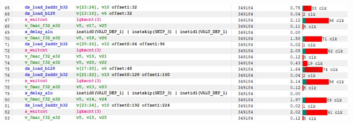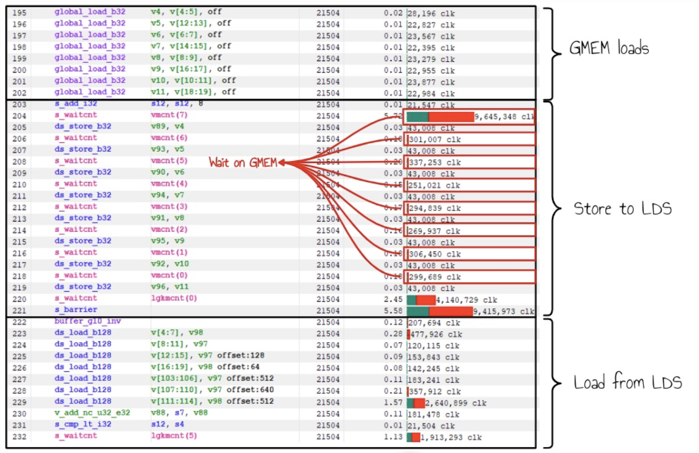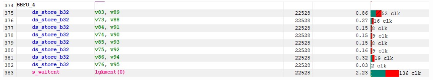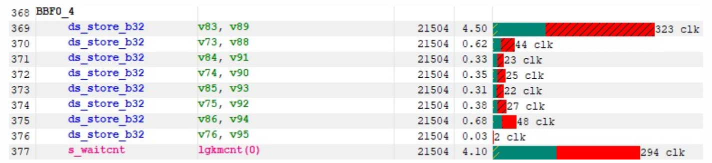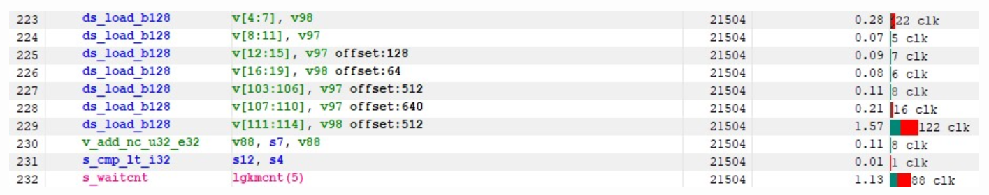 - 이러한 LDS 로드에서 일관된 90사이클 정지(숨겨지지 않음)가 발생합니다(s_waitcnt lgkmcnt(X) 명령어 확인)