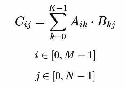for i from 0 to M - 1: # Loop over rows of A for j from 0 to N - 1: # Loop over columns of B sum = 0 for k from 0 to K - 1: # Loop over columns of A / rows of B sum += A[i][k] * B[k][j] end for C[ i ][ j ] = sum end for end for |