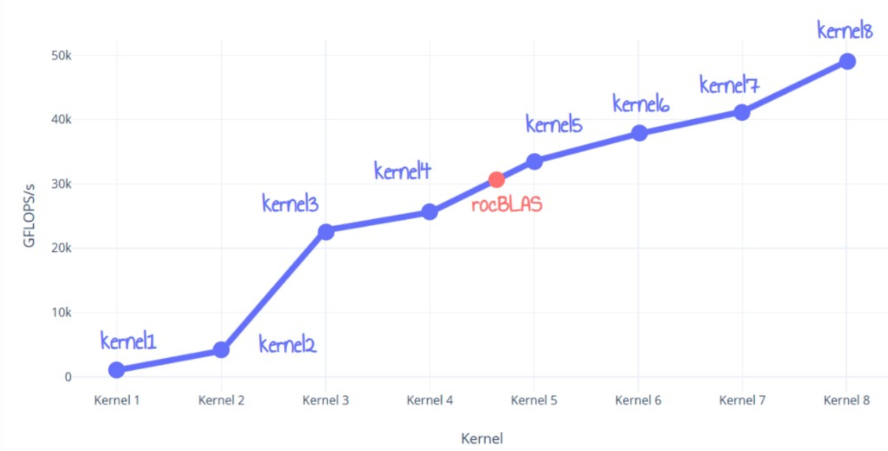 이제 성능 측면에서 최악의 구현을 살펴보았으니 공식 rocBLAS 구현을 살펴보겠습니다.