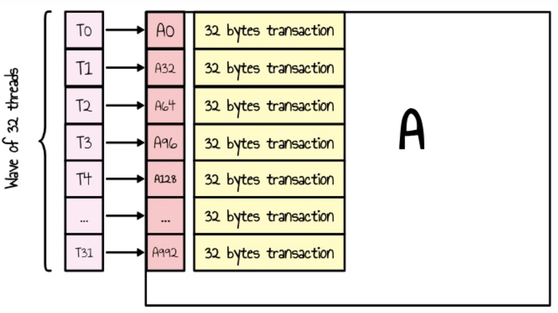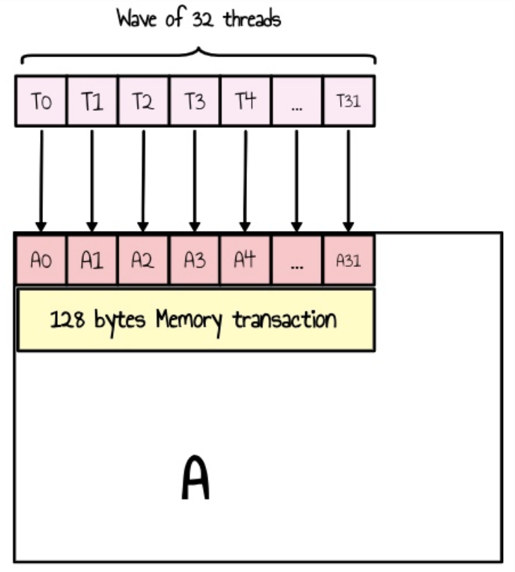 ISA 가이드에 따르면, 장치 메모리는 32, 64 또는 128바이트 트랜잭션을 통해 액세스되며, 이는 자연스럽게 정렬되어야 합니다. 메모리 처리량을 극대화하려면 웨이브 내의 스레드 간에 메모리 액세스를 통합하여 트랜잭션 수를 최소화해야 합니다8