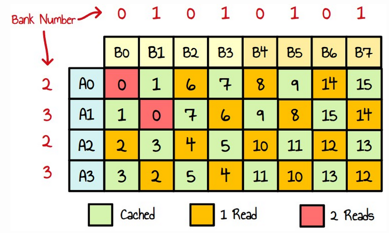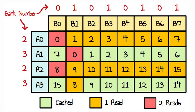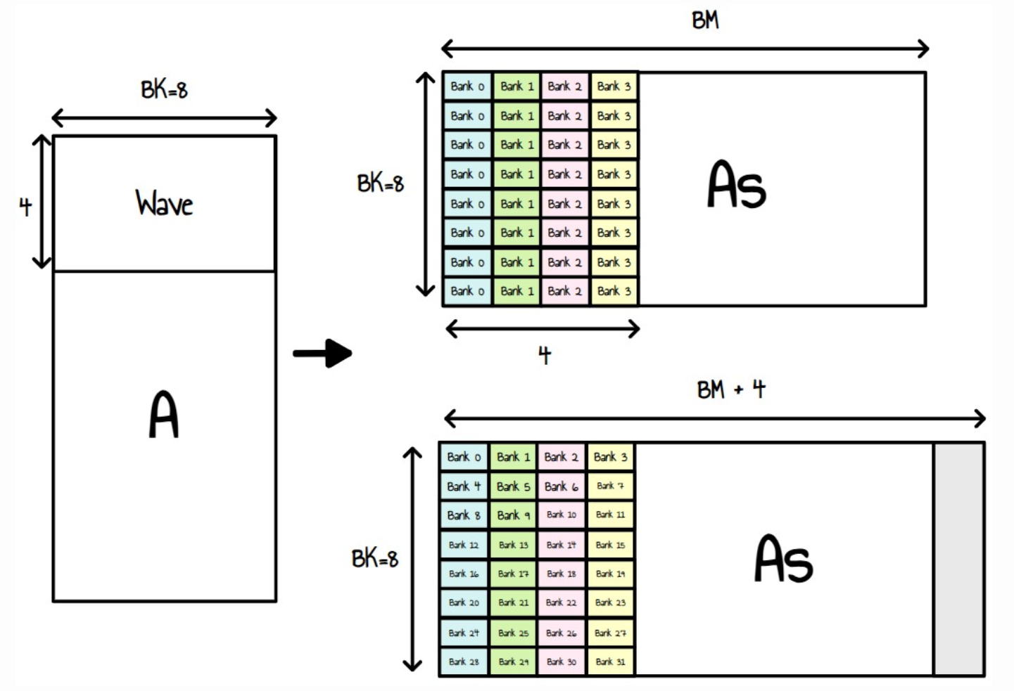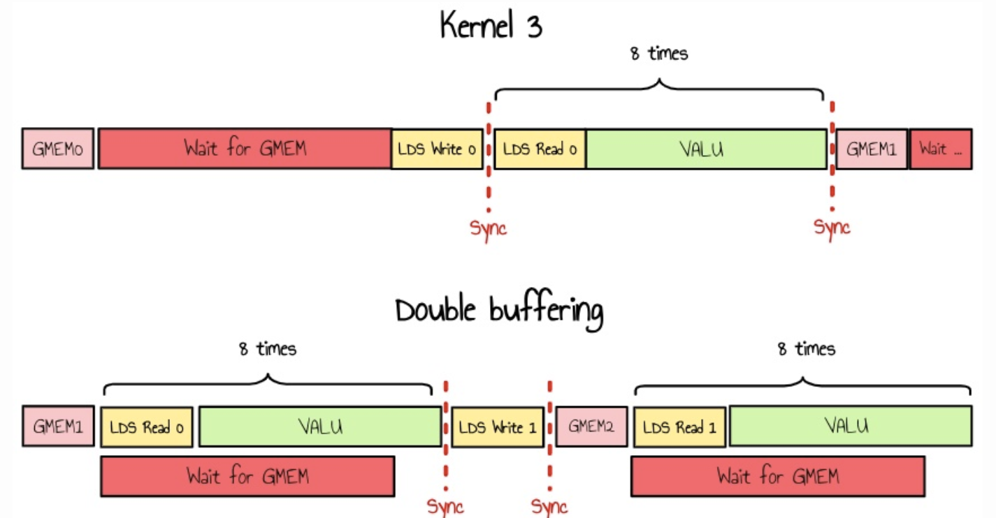 이를 완화하는 한 가지 방법은 이중 버퍼링을 사용하는 것입니다. 메모리를 두 배로 할당하고 LDS에 대한 읽기 및 쓰기를 병렬로 수행할 수 있습니다.
