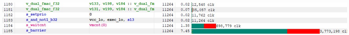 RGP의 총 지연 시간(Clk)을 살펴보면, 가장 큰 원인은 배리어 대기입니다. 바로 앞의 s_waitcnt는 글로벌 메모리 로드 대기입니다.