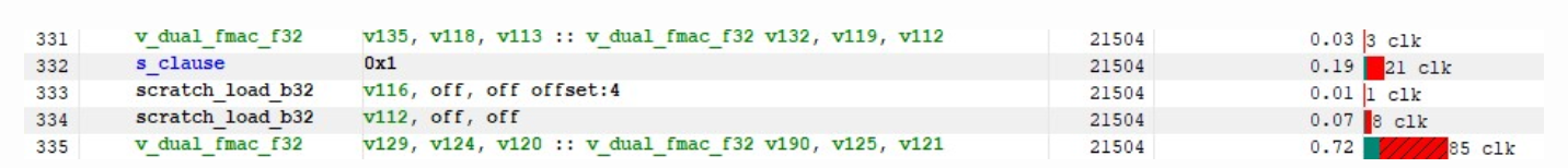 - v_dual_fmac은 평균 1 클럭 지연 시간을 갖습니다.