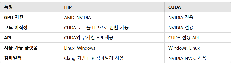 - Cuda와 매우 유사한 코드구조를 가지며, 코드 변환을 쉽게 할 수 있도록 설계되었다. hipify를 사용하면 기존 CUDA코드를 HIP코드로 자동 변환할 수 있음