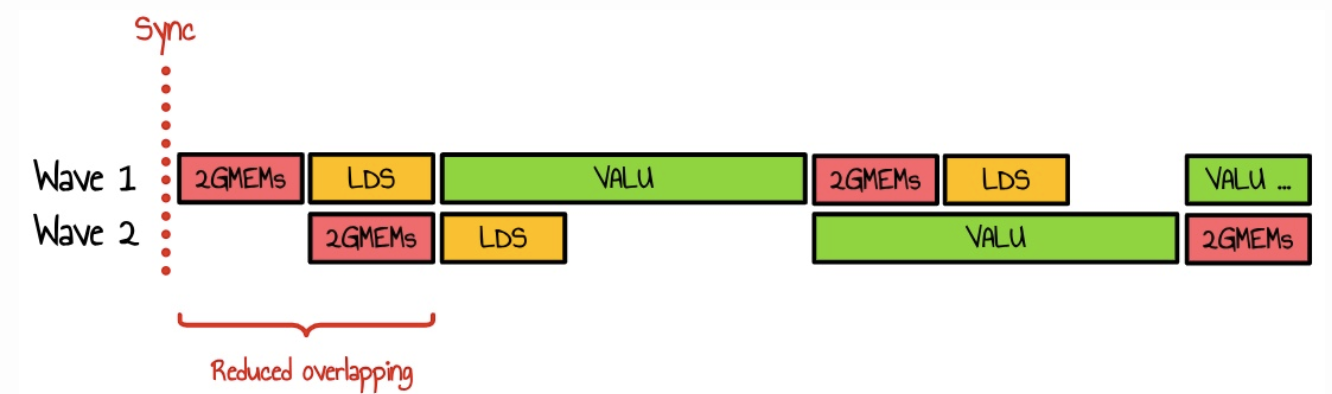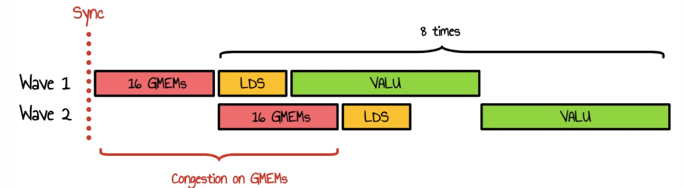 몇 가지 실험을 해 본 결과, 이 16개의 부하를 내부 루프에 분산하는 것이 더 효율적이라는 것을 알게 되었습니다. 현재 저희 커널은 SIMD당 6개의 웨이브프런트를 실행합니다. 작업 그룹은 128개의 스레드(4개의 웨이브)로 구성되어 있으므로, 싱크스레드(syncthread)를 실행할 때마다 SIMD의 6개 웨이브 중 최소 2개가 GMEM 접근을 위해 경쟁하게 됩니다. 또한, 나머지 4개 웨이브 중 하나라도 동일한 상태에 있다면 더 많은 웨이브가 메모리 접근을 위해 경쟁할 수 있습니다.
