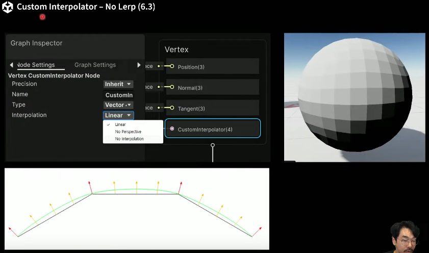 Shader Graph Custom Interpolators라는 항목이 새로 들어왔는데 이는 보간기(interpolator)의 보정 설정을 지정할 수 있는 명령이다.