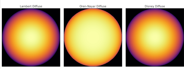 - Oren-Nayar : 거칠기(Roughness) 있는 표면에서 확산 반사를 좀 더 자연스럽게 표현.