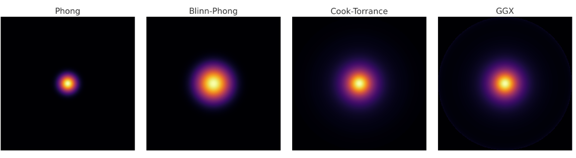 - GGX (Trowbridge-Reitz) : Cook-Torrance 기반 현대 표준. 거칠기가 높은 표면에서도 자연스러운 긴 하이라이트 표현 가능.